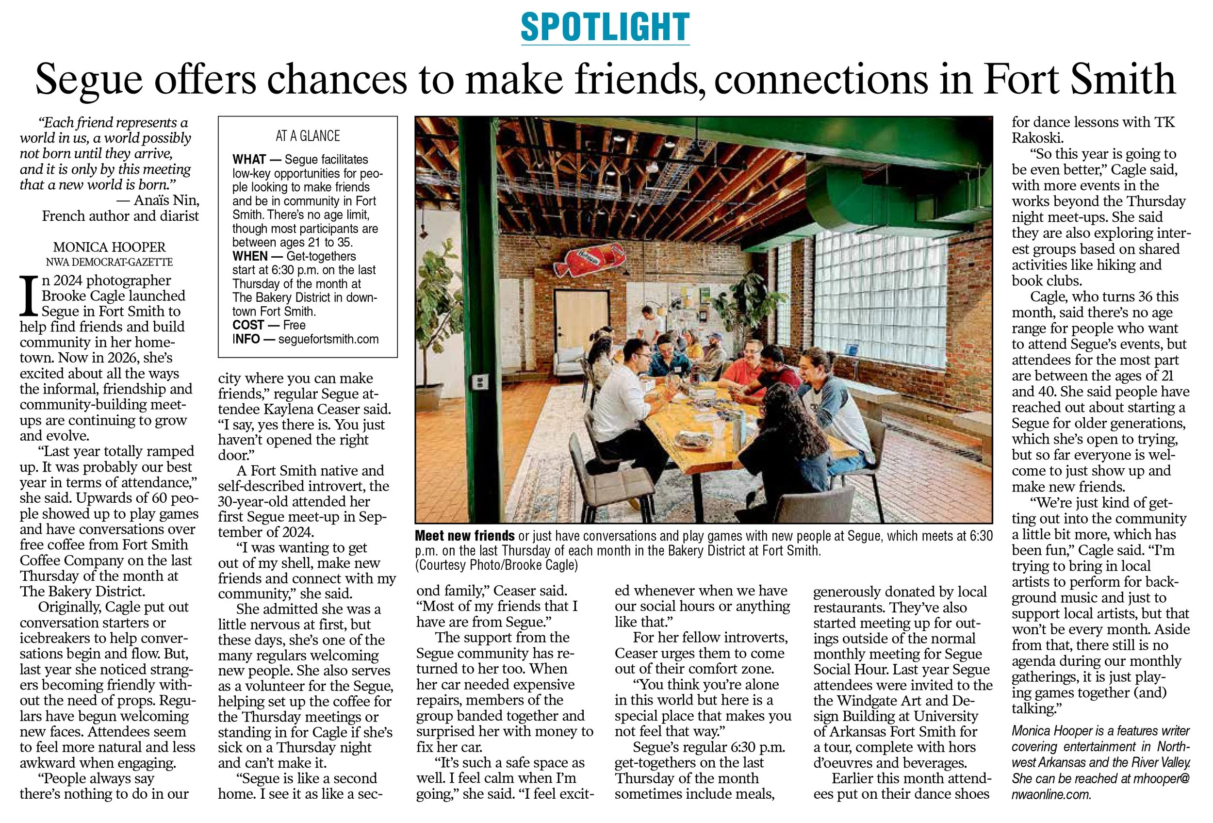 Segue meets once a month at the Bakery District in downtown Fort Smith, Arkansas. Find out more about our event schedule & location details.