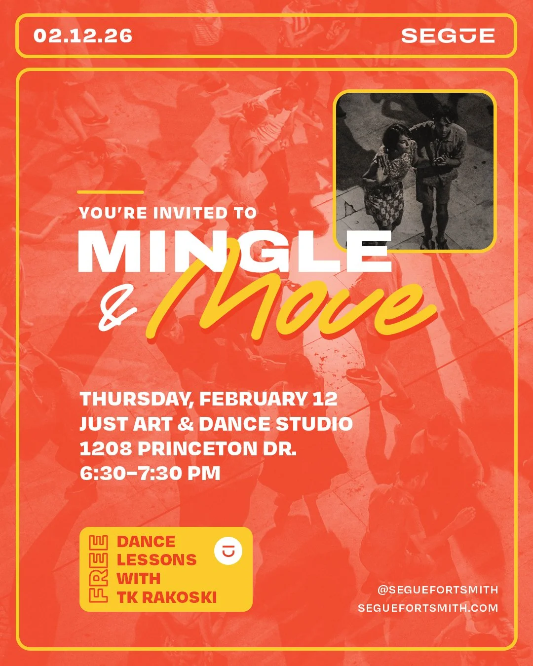 Join us on Thursday, February 12 at 6:30pm for some free dancing lessons with TK Rakoski. We will be meeting at TK’s dance studio located at 1208 Princeton Dr. in Fort Smith, AR. Let’s get out of our comfort zones together and try something new! GET SOCIAL. Hope to see you there!